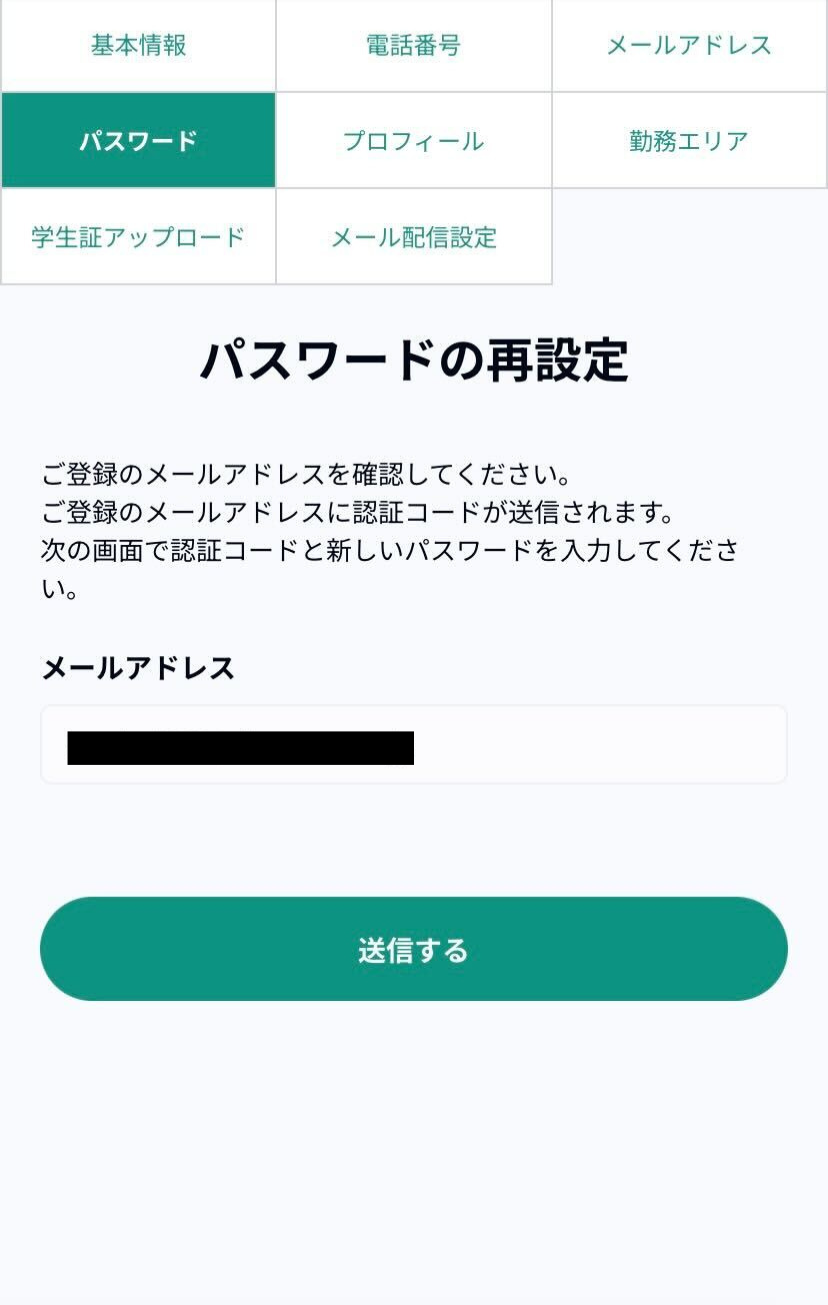 「パスワードの再設定」ページから入力されているメールアドレスがスマートレーダーに登録したLINEに設定されているメールアドレスかご確認いただき、「送信する」をクリックして認証コードを受け取ってください。
