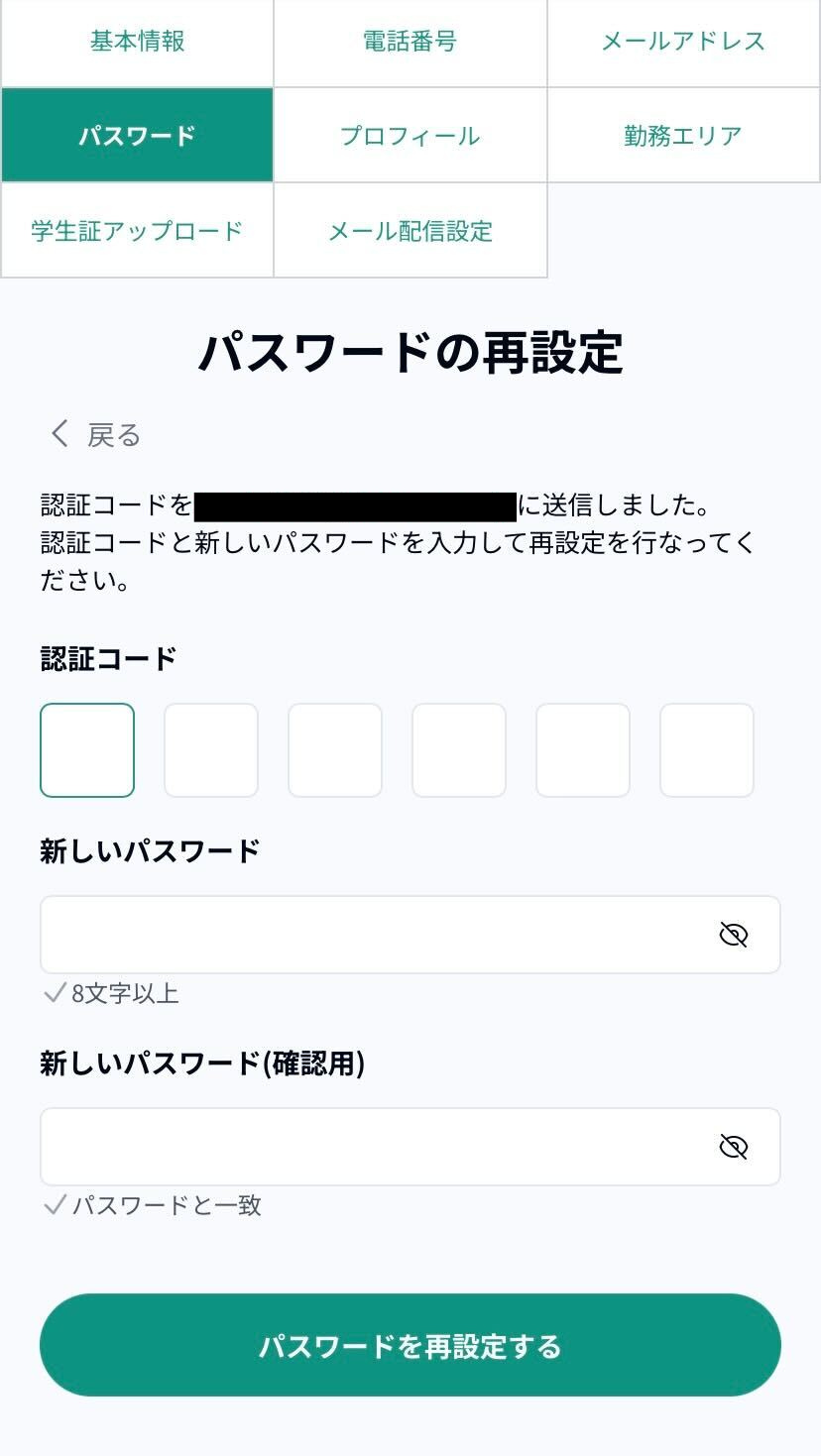 認証コードが入力されているメールアドレスに送信されますので、次のページより認証コードと新しいパスワードを入力し「パスワードを再設定する」をクリックすることで、メールアドレスとパスワードでログインすることができるようになります。