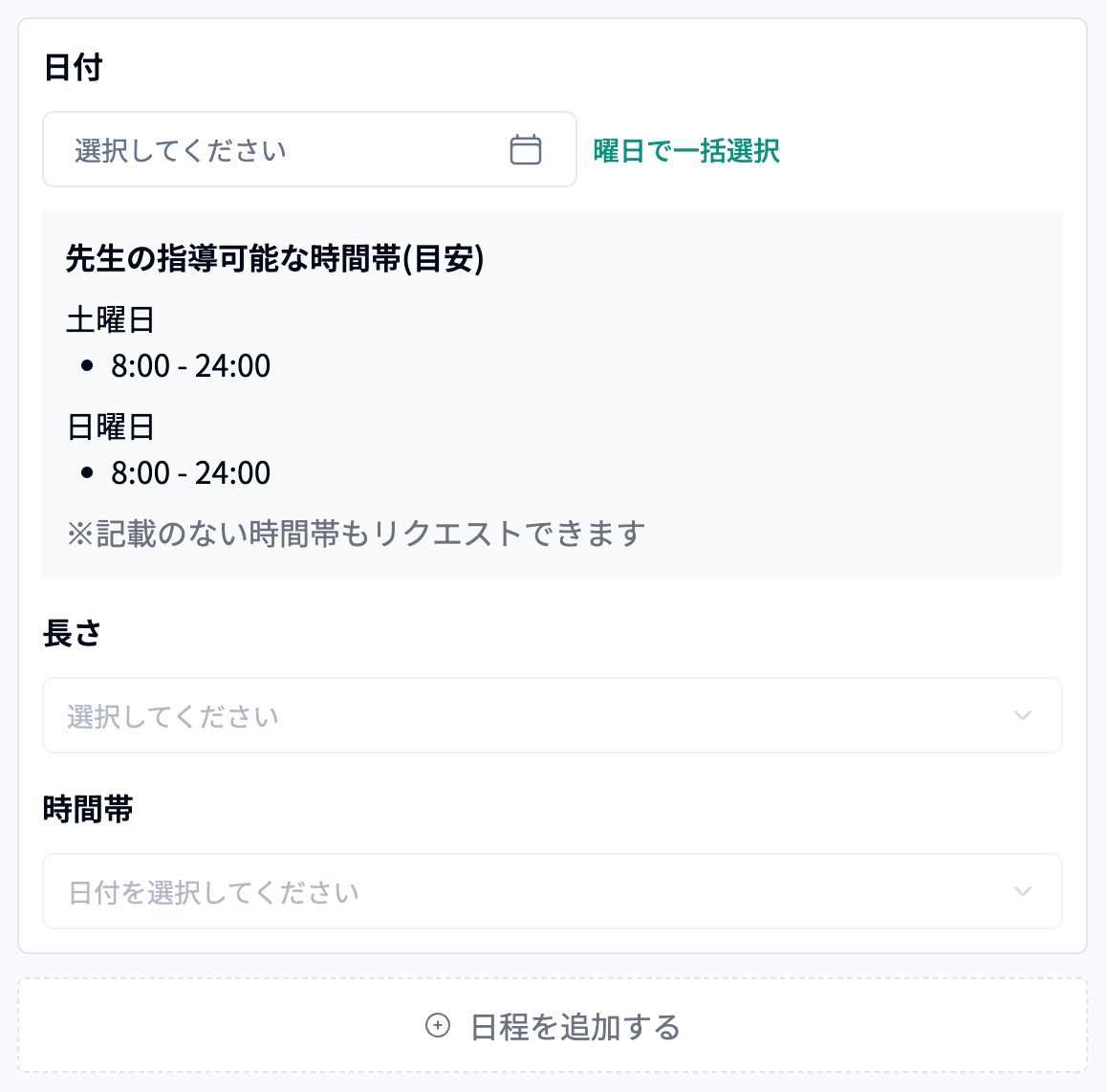 ここから「期間」・「曜日」・「長さ」・「時間帯」を正しく選択し、「日程を追加する」を選択してください。不備がある場合は「曜日で一括追加」から変更していただき再度ご確認の上、「日程を追加する」を選択してください。