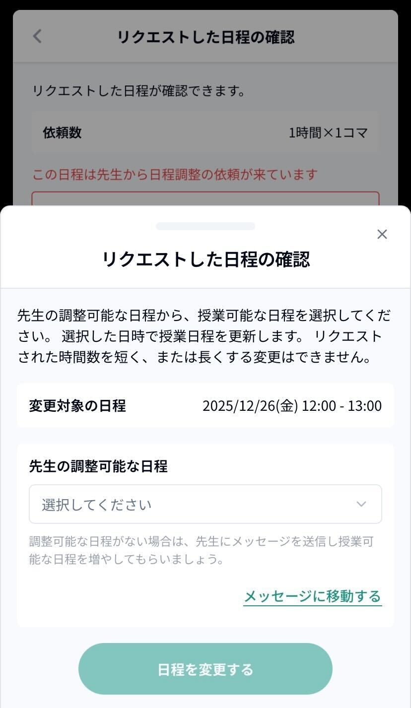 日程変更ボタンを押した後は先生の日程承認をお待ちください。