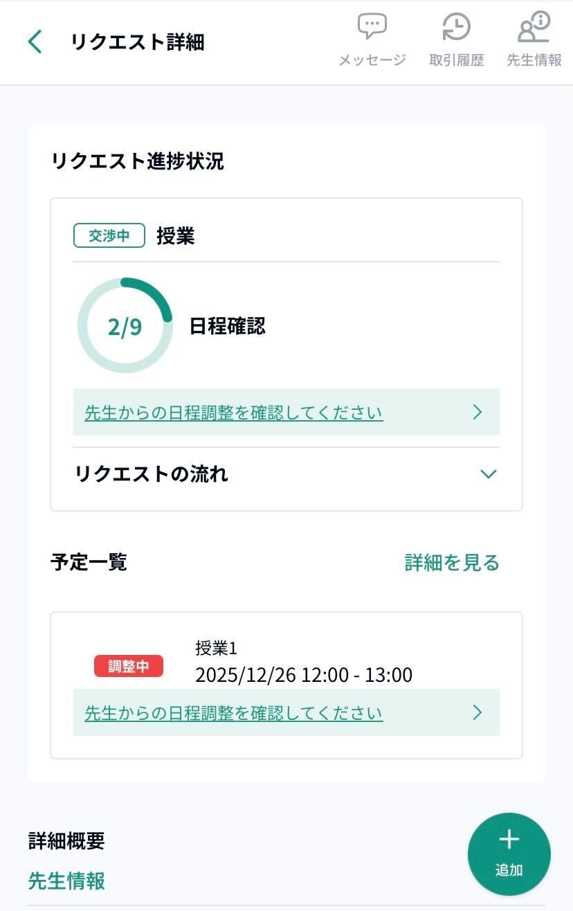 先生の調整可能な日程を確認し、希望する日程を選択してください。この時、もともと依頼していた時間の長さを変更することはできません。元の時間分をご選択ください。