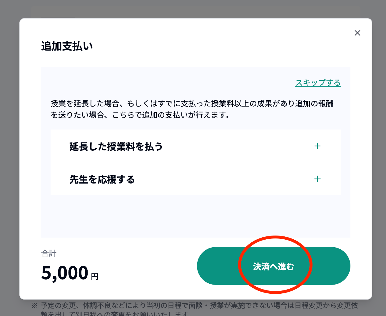 - 「延長した授業料を払う」または「先生を応援する」ボタンを選択し、金額をご入力の上「決済へ進む」ボタンを押してください ※ご入力いただいた金額からシステム手数料(25%+税)が引かれた額が先生に支払われます