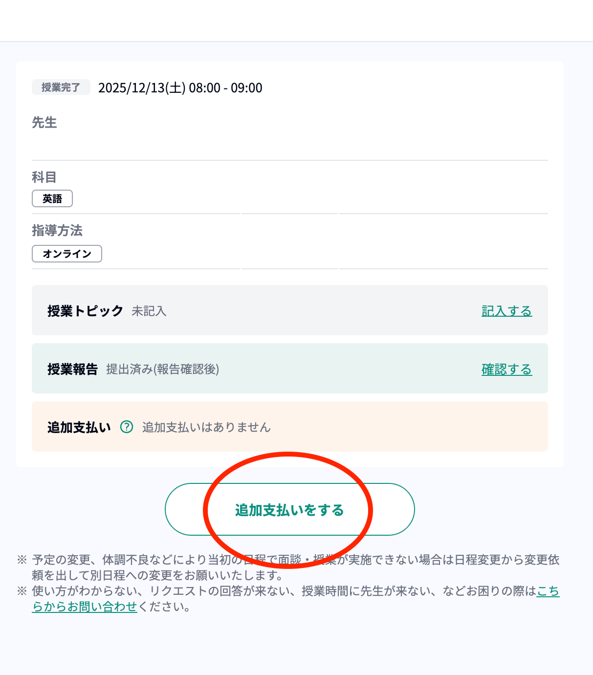 決済が完了すると、依頼者様と先生の両方の授業詳細画面へ内容が反映されますのでご確認ください。