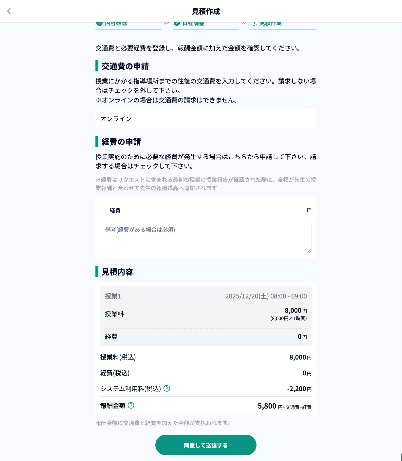 授業日程が決まったら、見積もりを送信します。間違いがないか確認した上で見積もりを送信しましょう。