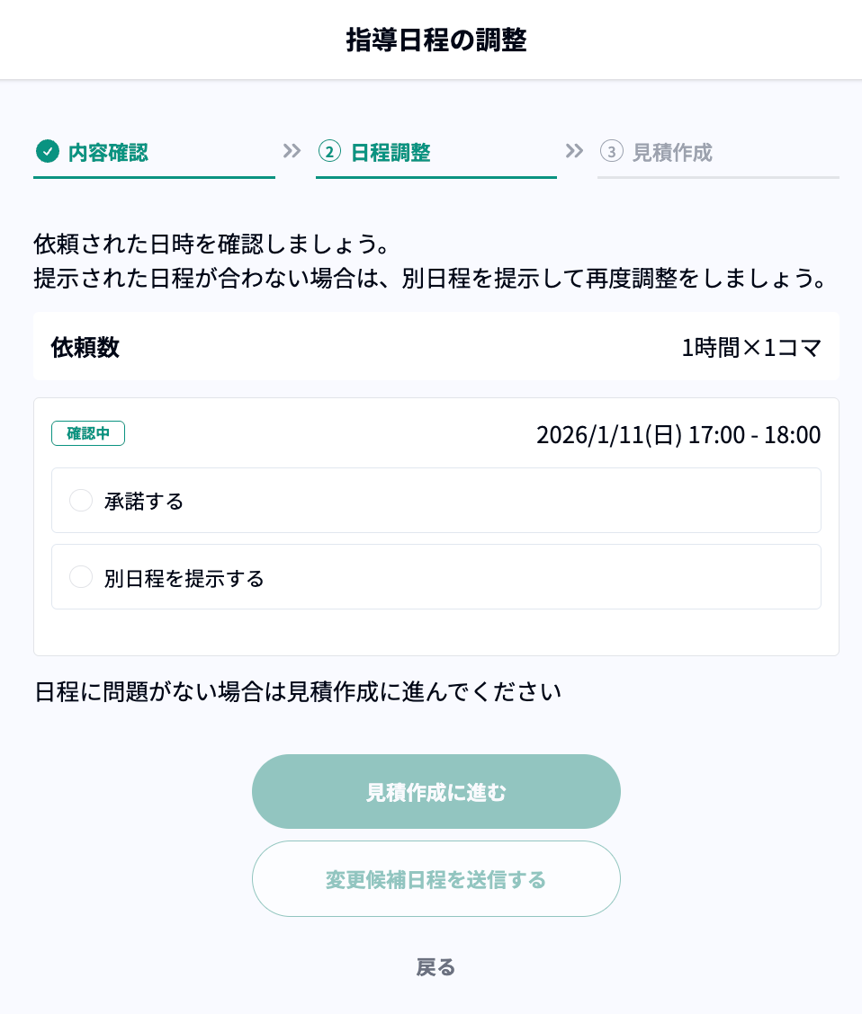 リクエストされた日程で授業ができない場合には、「別日程を提示する」から別日程を提示しましょう。