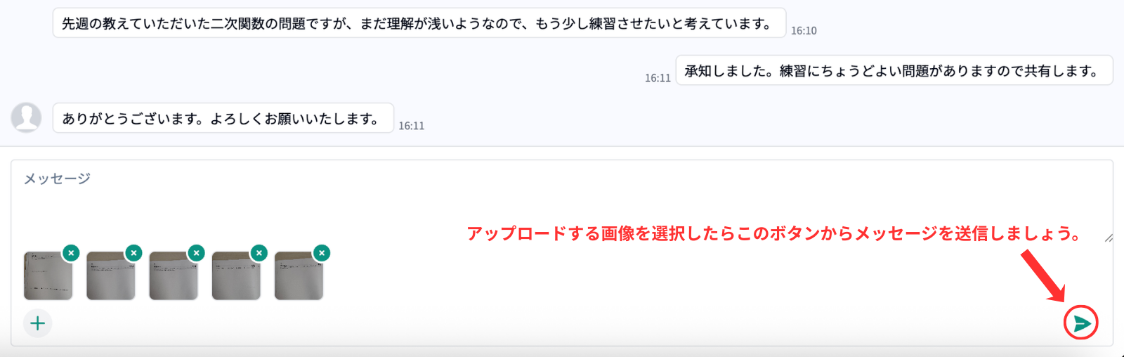 共有したい教材の画像を選択し、メッセージを送信してください。