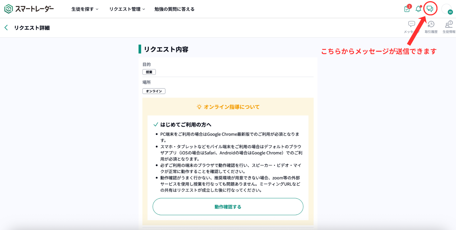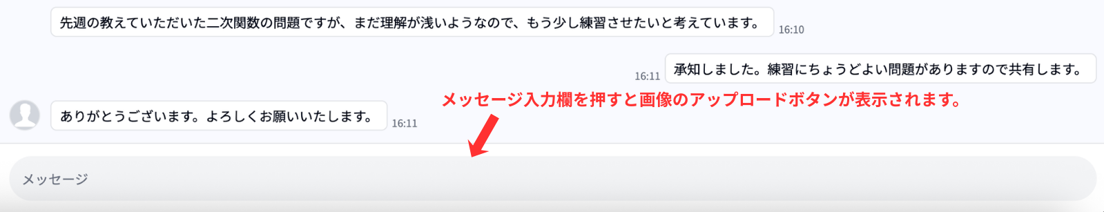 授業で使用する教材や問題を共有したい場合は、スマートレーダーのメッセージ機能で画像を送信することで共有できます。