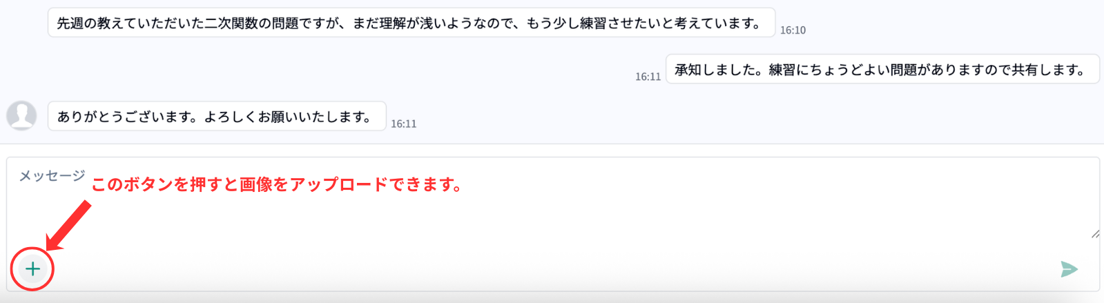 メッセージ入力欄を押すと、左下に+マークの画像アップロードボタンが表示されるので、ボタンを押します。