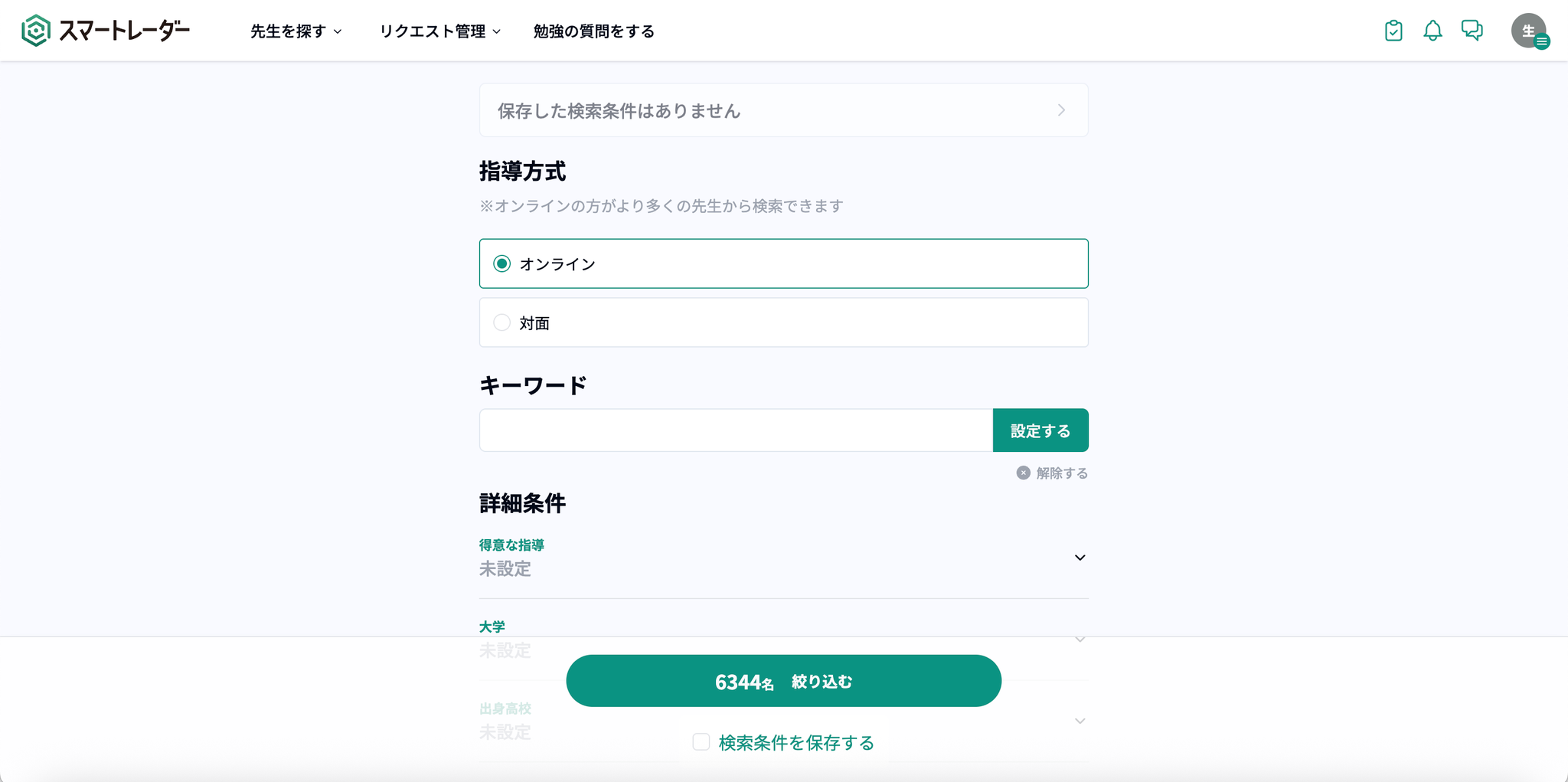 以下の条件で先生の検索が可能ですので、ご希望の条件に合わせて先生をお探しいただけます。