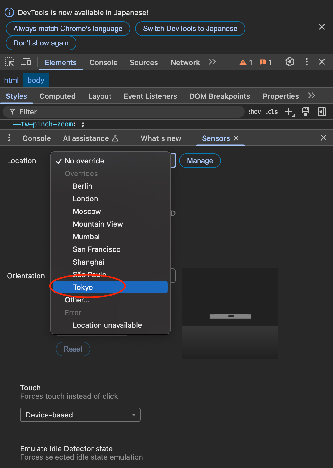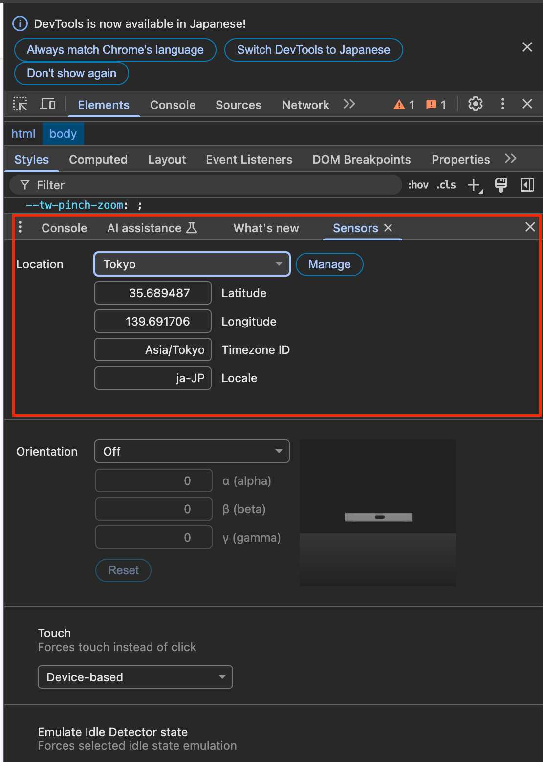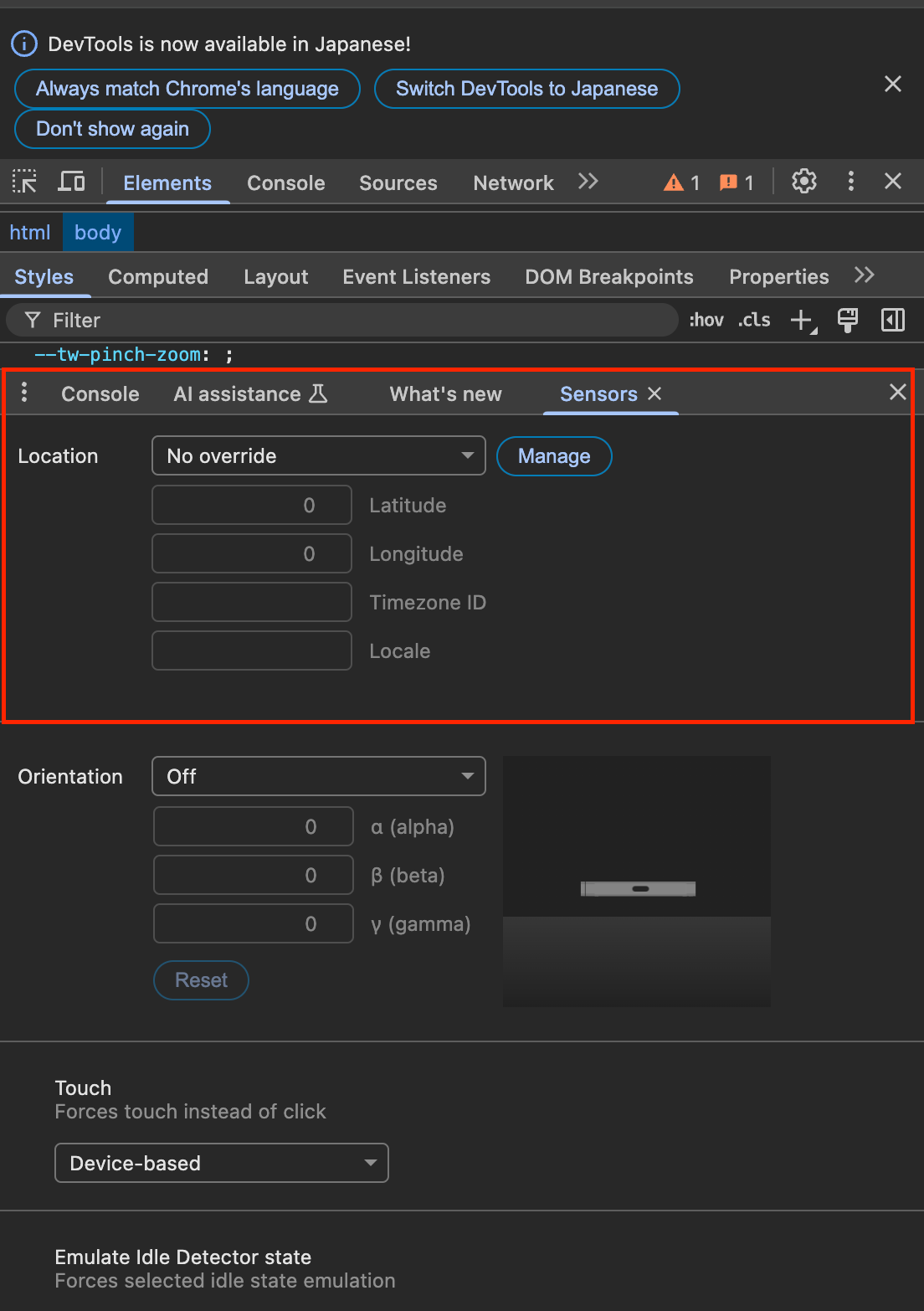 ディベロッパーツール画面下部に「Sensors」が表示されます