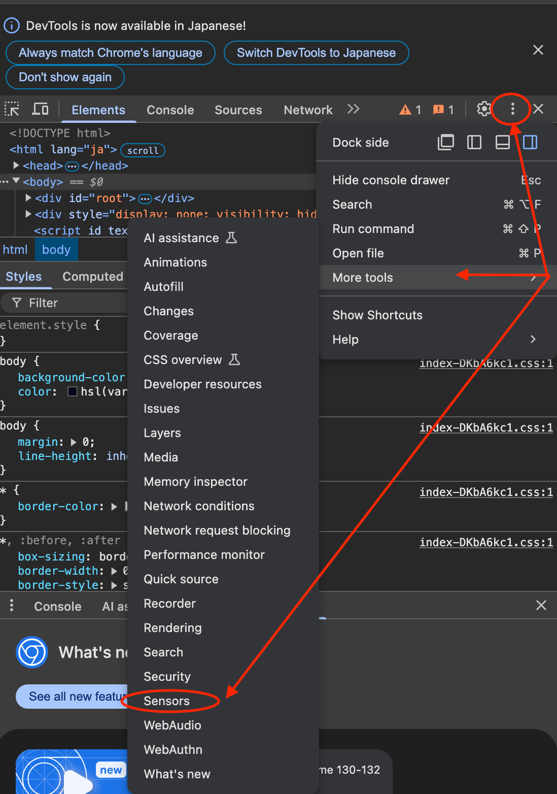 ディベロッパーツールの右上の「・・・」をクリック > More tools > Sensors をクリックします