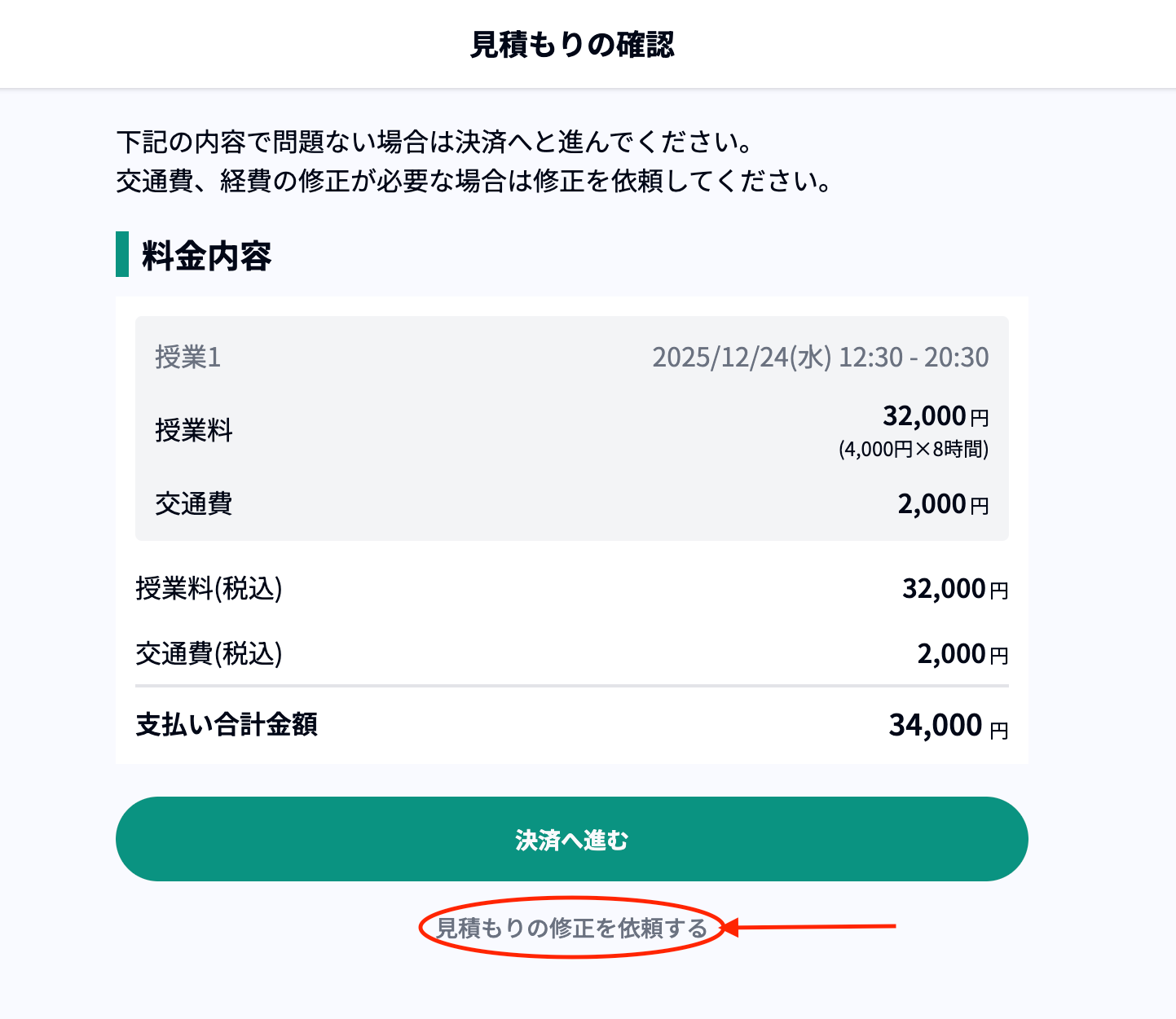 先生から送信される見積もりをご決済前にご確認の上、ご決済ください。