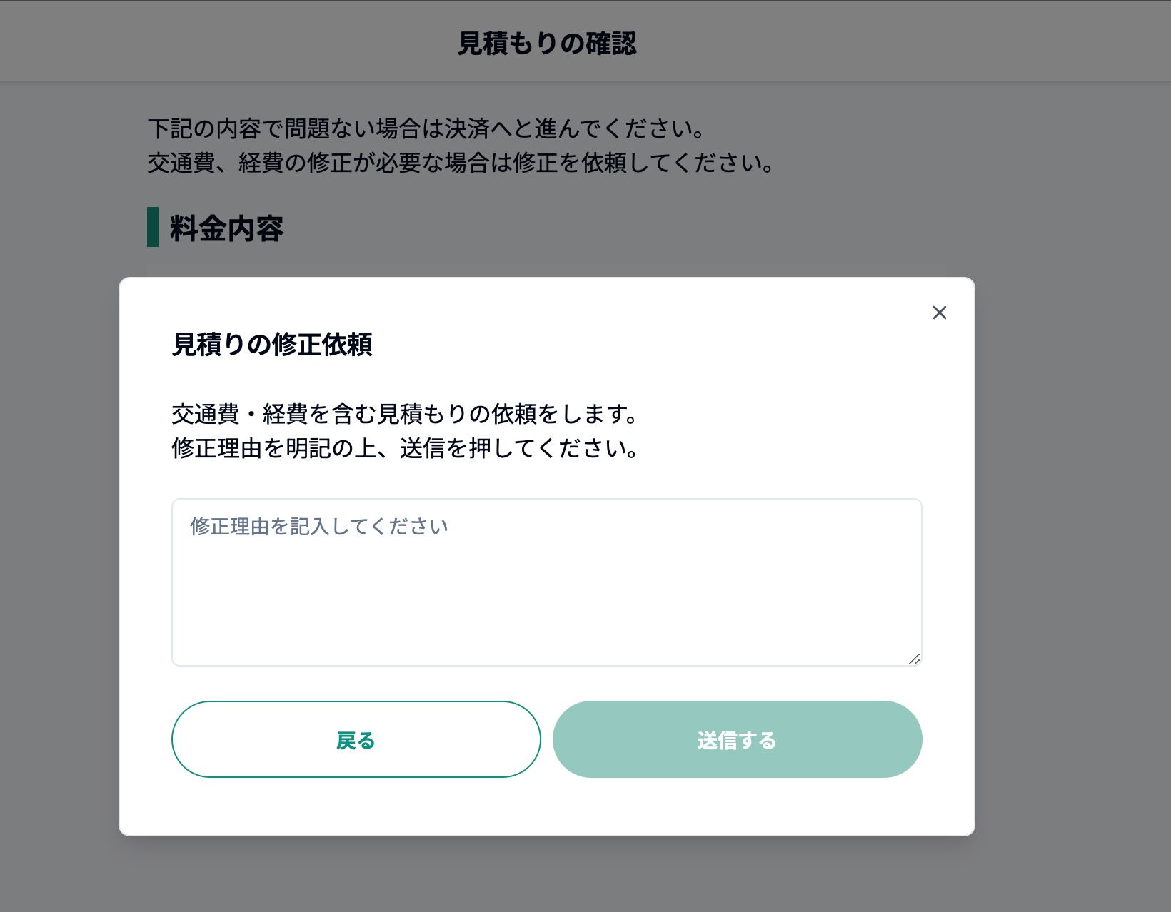 「見積もりの修正を依頼する」>修正理由を記入して「送信する」ボタンを押す