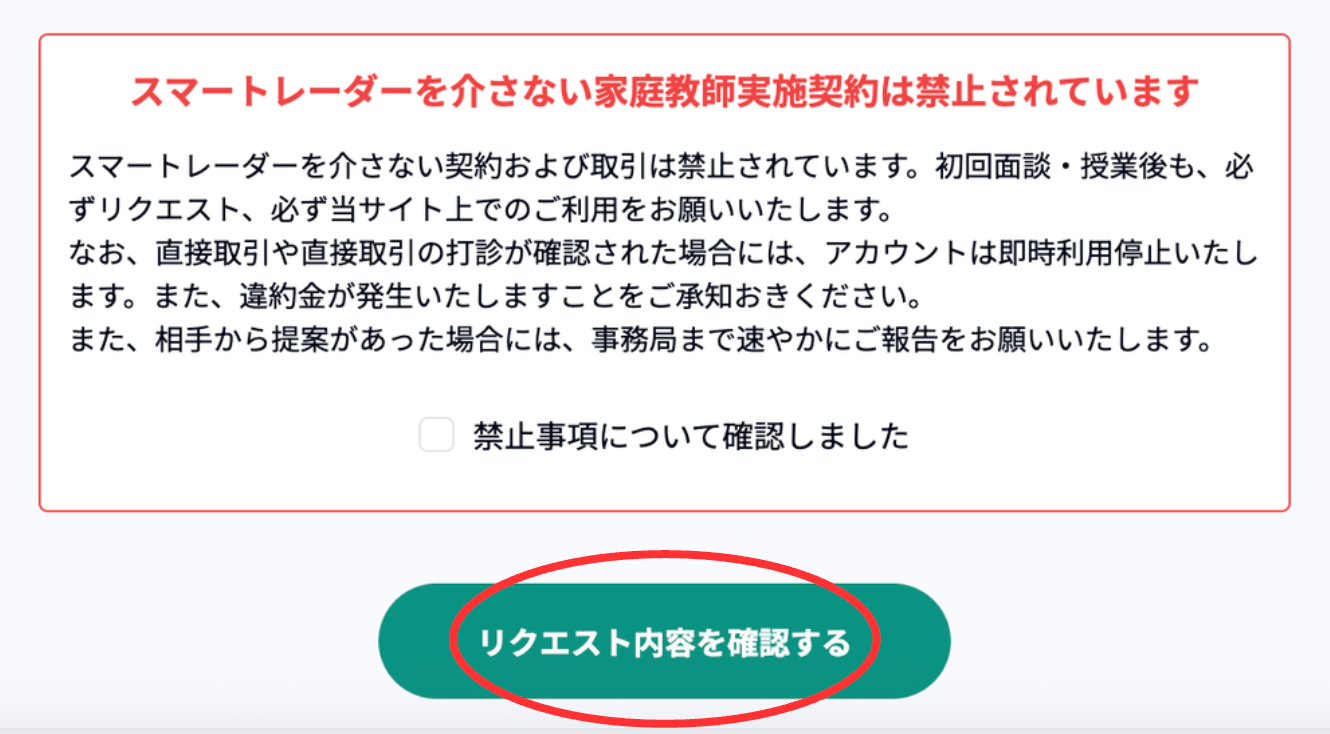 はじめに1、スマートレーダーご利用上のルール先生との直接取引・金銭授受の禁止授業の実施、授業報告の確認義務授業料について2、面談、授業のご依頼方法リクエストの送信方法①初めにリクエストについてチェック項目をご確認ください。②生徒選択③リクエスト目的④指導場所⑤科目、メッセージ⑥スケジュール3、リクエスト送信後の調整(日程調整と決済方法について)リクエスト画面の使い方日程変更依頼が届いた場合日程が承認された場合見積もりの確認と決済4、当日までに準備する事と注意点オンライン面談、授業の場合5、指導のキャンセル、予定変更について▼日程変更方法▼キャンセルを希望する場合6、授業後の手続きについて(授業報告確認・追加支払い・レビュー送信)▼授業報告の確認方法7、継続依頼を希望する場合