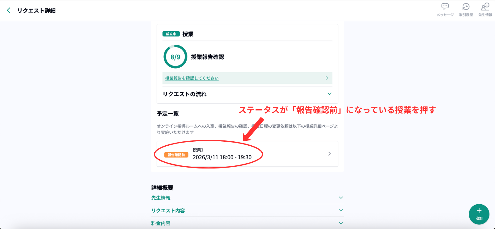 先生から授業報告が提出されるとスケジュールのステータスが「報告確認前」となります。
