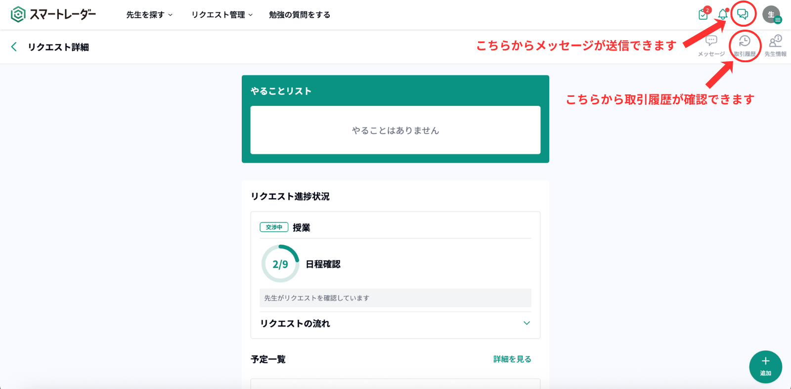 画面右上のメッセージボタンをクリックするとメッセージ画面に移動し、先生とメッセージをやりとりしていただけます。日程が承認されない場合は先生から日程変更依頼が来ます。